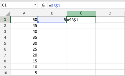 Let's have a look at an example where we add B(5) to the range A1:A10 using absolute reference and the fill function.