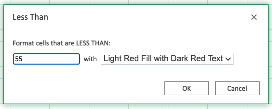 The "Less Than..." Highlight Cell Rule will highlight a cell with one of the appearance options based on the cell value being less than to your specified value.