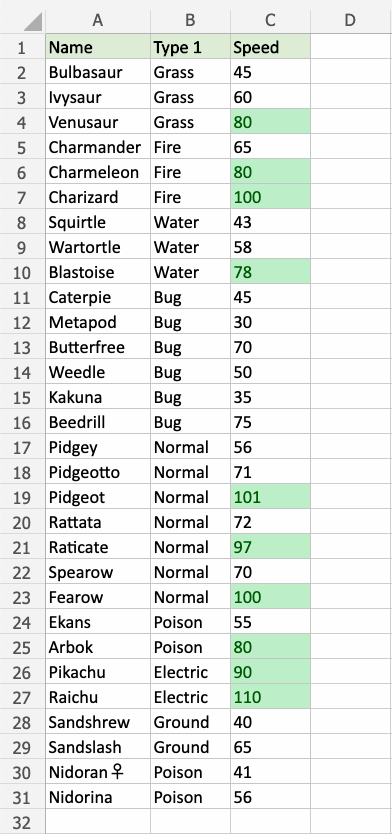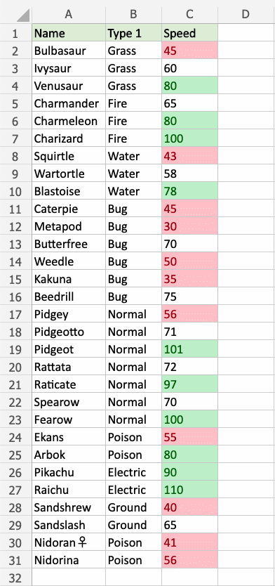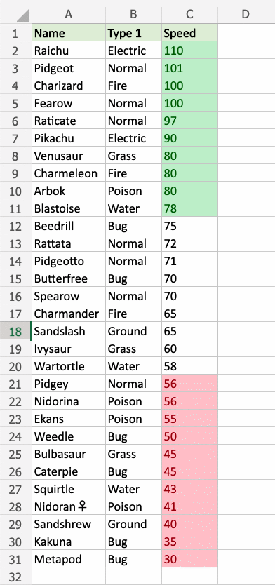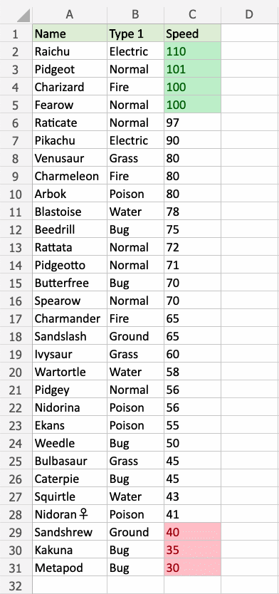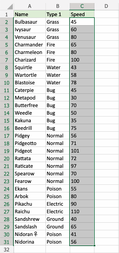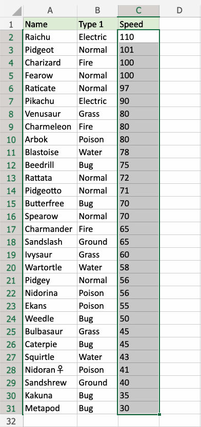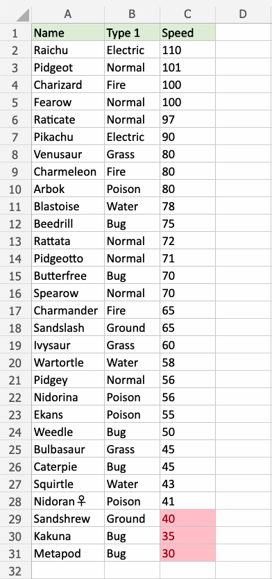 We can see that both Pidgey and Nidorina have a Speed of 56. So, they are tied for the 10th bottom value.