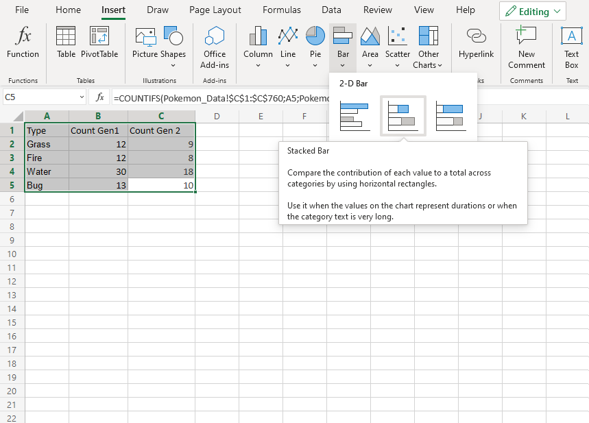 1. Click on the insert menu, then click on the bar menu () and choose Stacked Bar () from the drop-down menu