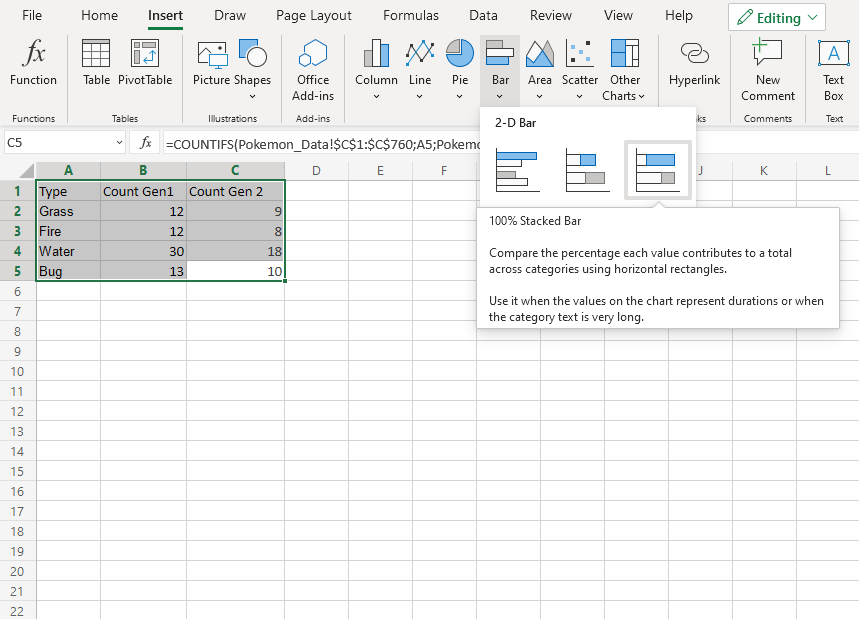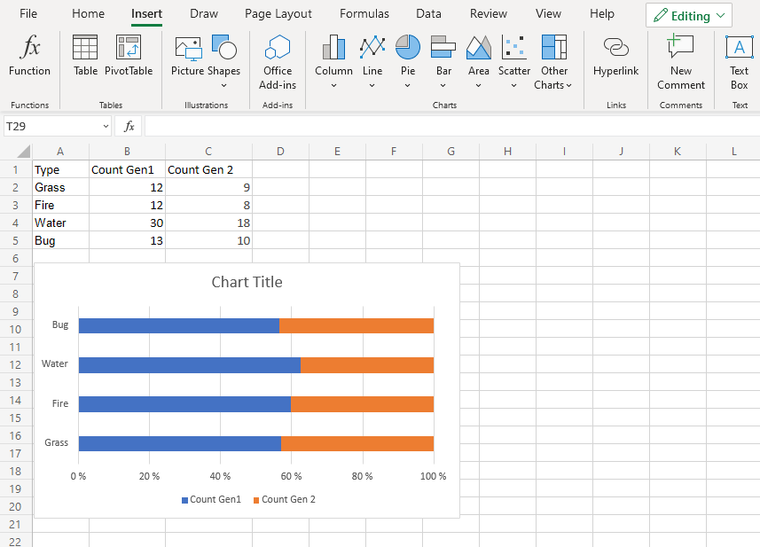 1. Click on the insert menu, then click on the bar menu () and choose 100% Stacked Bar () from the drop-down menu