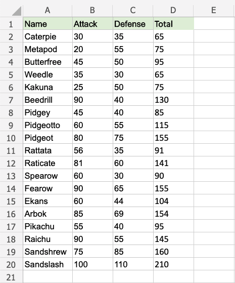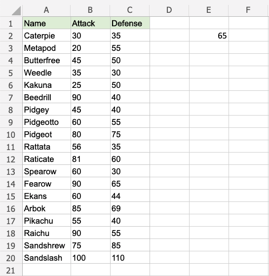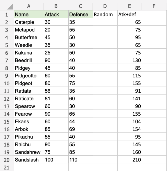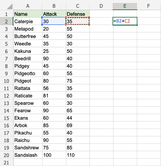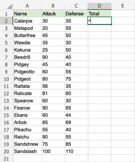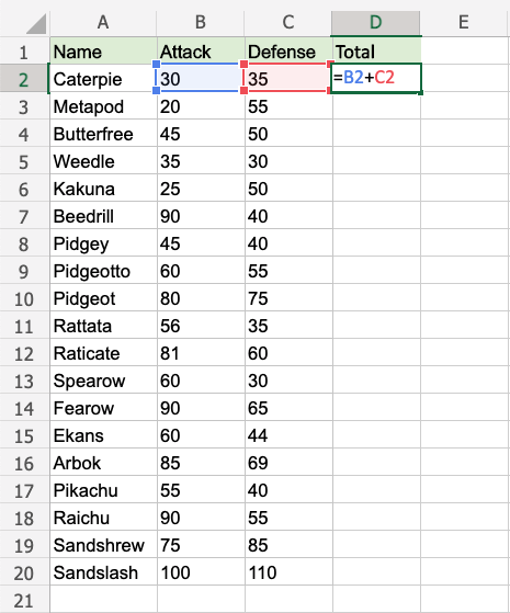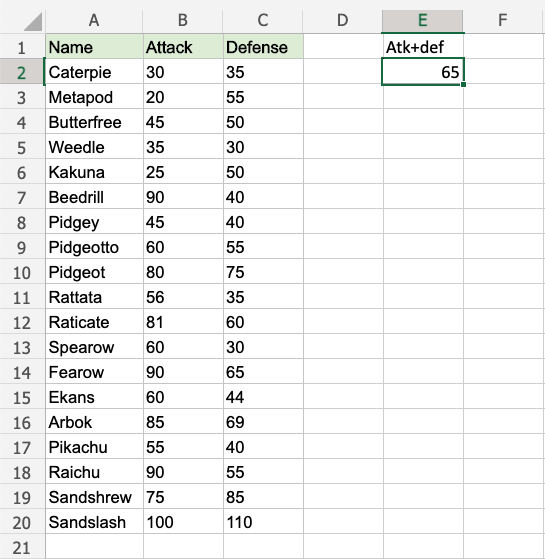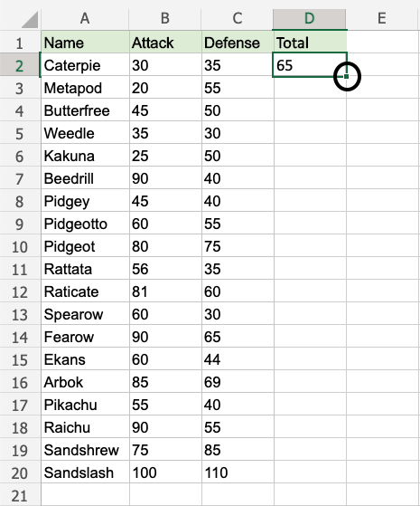 Let's use the Double click fill function to calculate the AttackB2:B20 + Defense C2:C20 for the Pokemons in the range D2:D20.