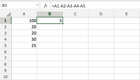You got it! You have successfully used absolute reference to subtract B1(5) from the minuend range A1:A10.