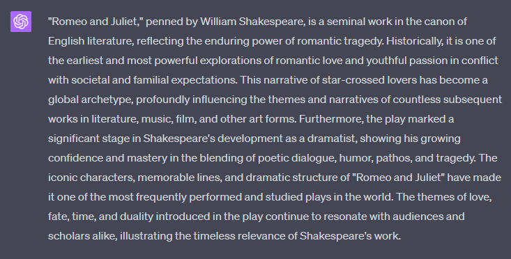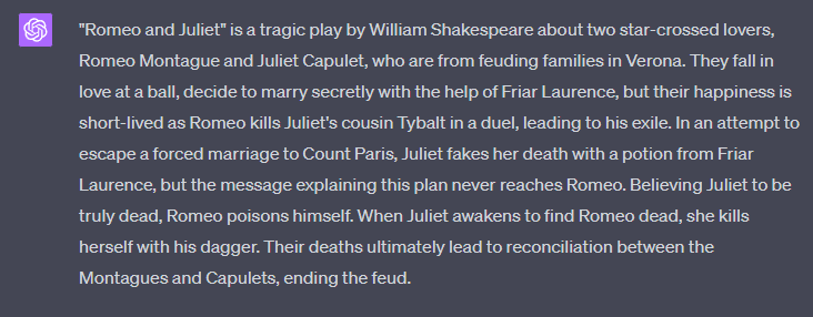 The previous example provided a basic summary of "Romeo and Juliet", but let's try and ask a few different ways: