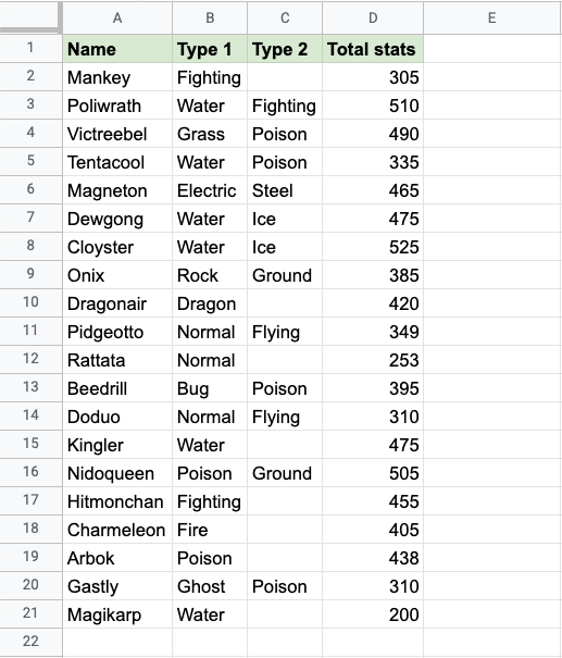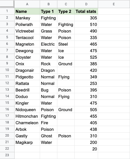 Apply the =COUNT function to range D2:D21. Counting the cells of Pokemon Total stats, which is numbers only: