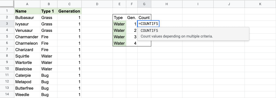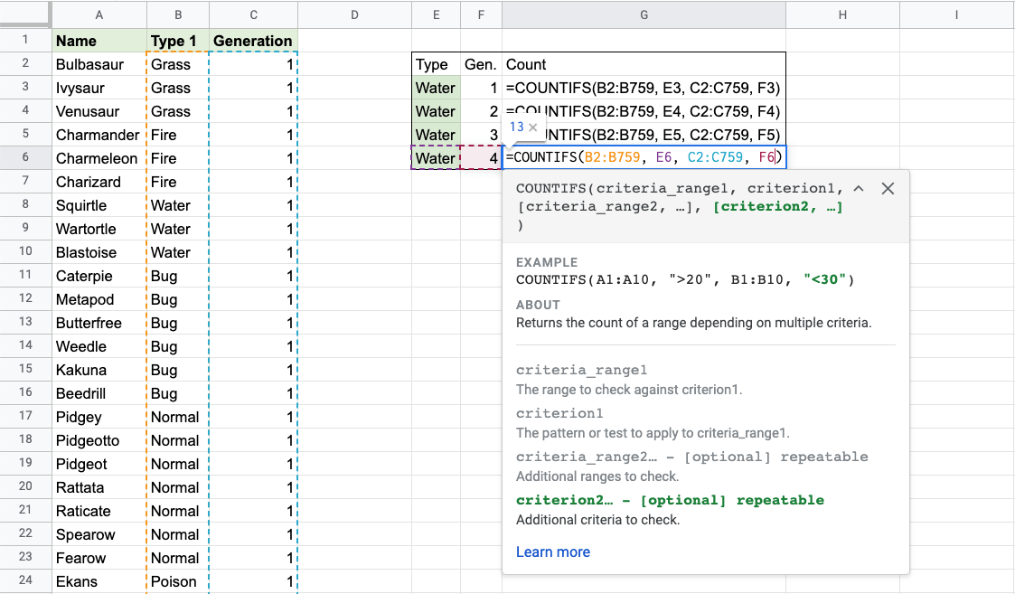Example COUNTIFS function, step by step: