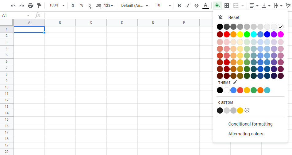 Google Sheets has a set of standard, theme and custom colors available for use. You select a color by clicking on it: