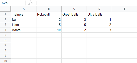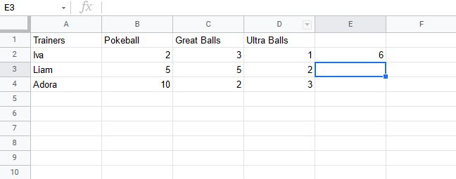 Let's help Iva to count her Pokeballs. You find Iva in A2(Iva). The values in row 2 B2(2), C2(3), D2(1) belong to her.