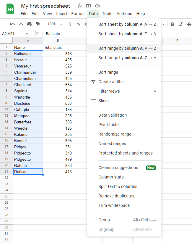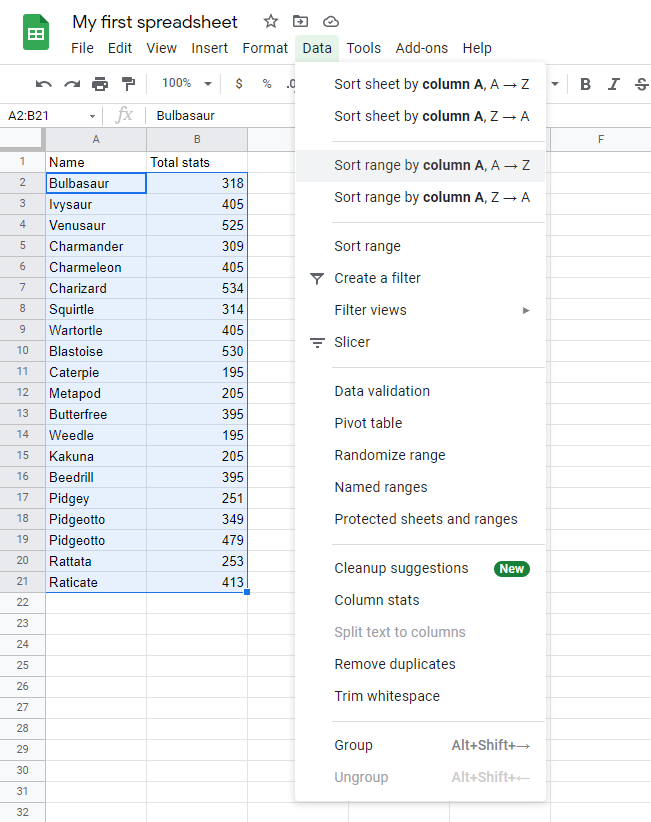 Sort the Pokemon in the range A2:A21 by their Name, ascending from smallest to largest (A-Z).
