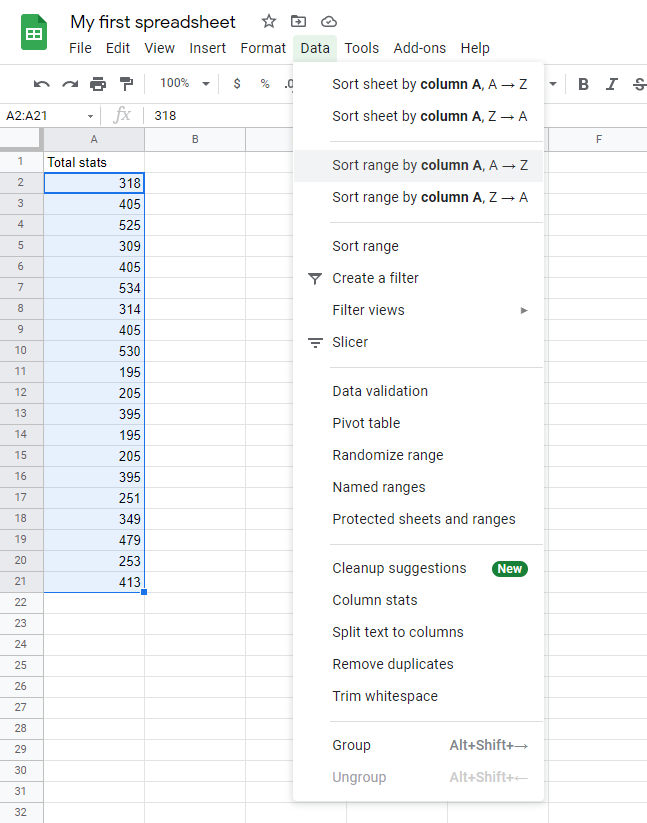 - Click on the Data menu and select Sort range by column A, A → Z
