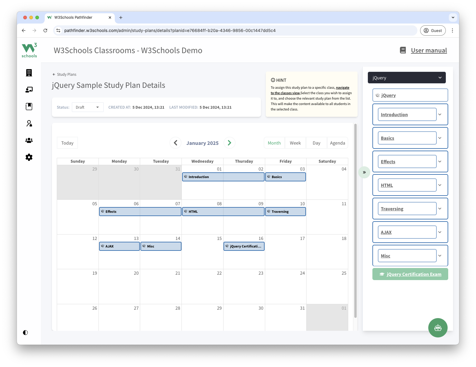 Save time with pre-built teacher materials and study plans. Easily organize your class with a timeline from the introduction of jQuery to the final exam.