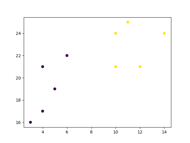 Finally, if we plot the same data and color the points using the labels assigned to each index by the hierarchical clustering method, we can see the cluster each point was assigned to: