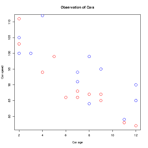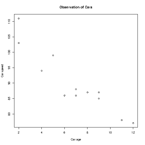 plot(x, y, main="Observation of Cars", xlab="Car age", ylab="Car speed")