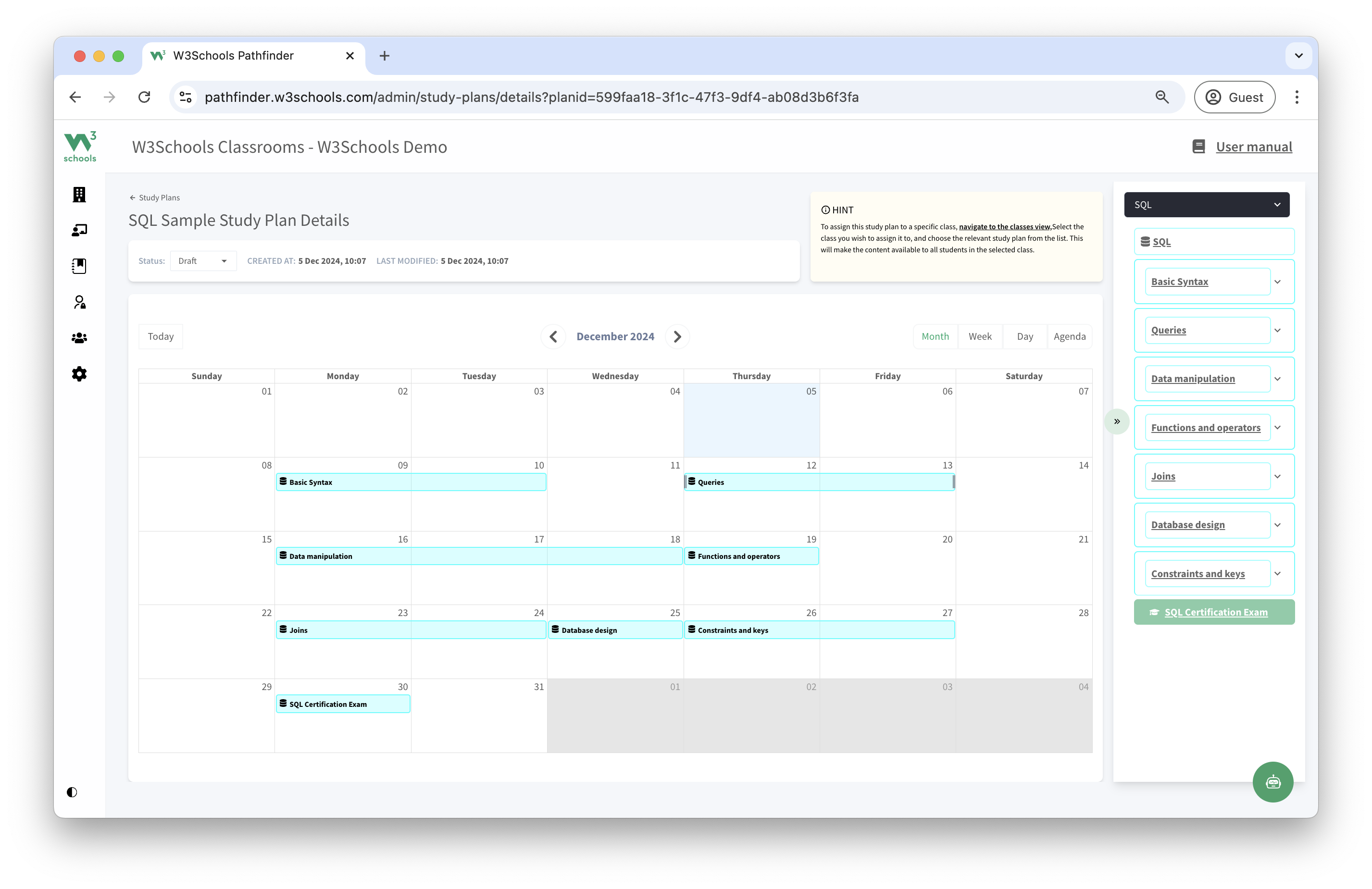 Save time with pre-built teacher materials and study plans. Easily organize your class with a timeline from the introduction of SQL to the final exam.